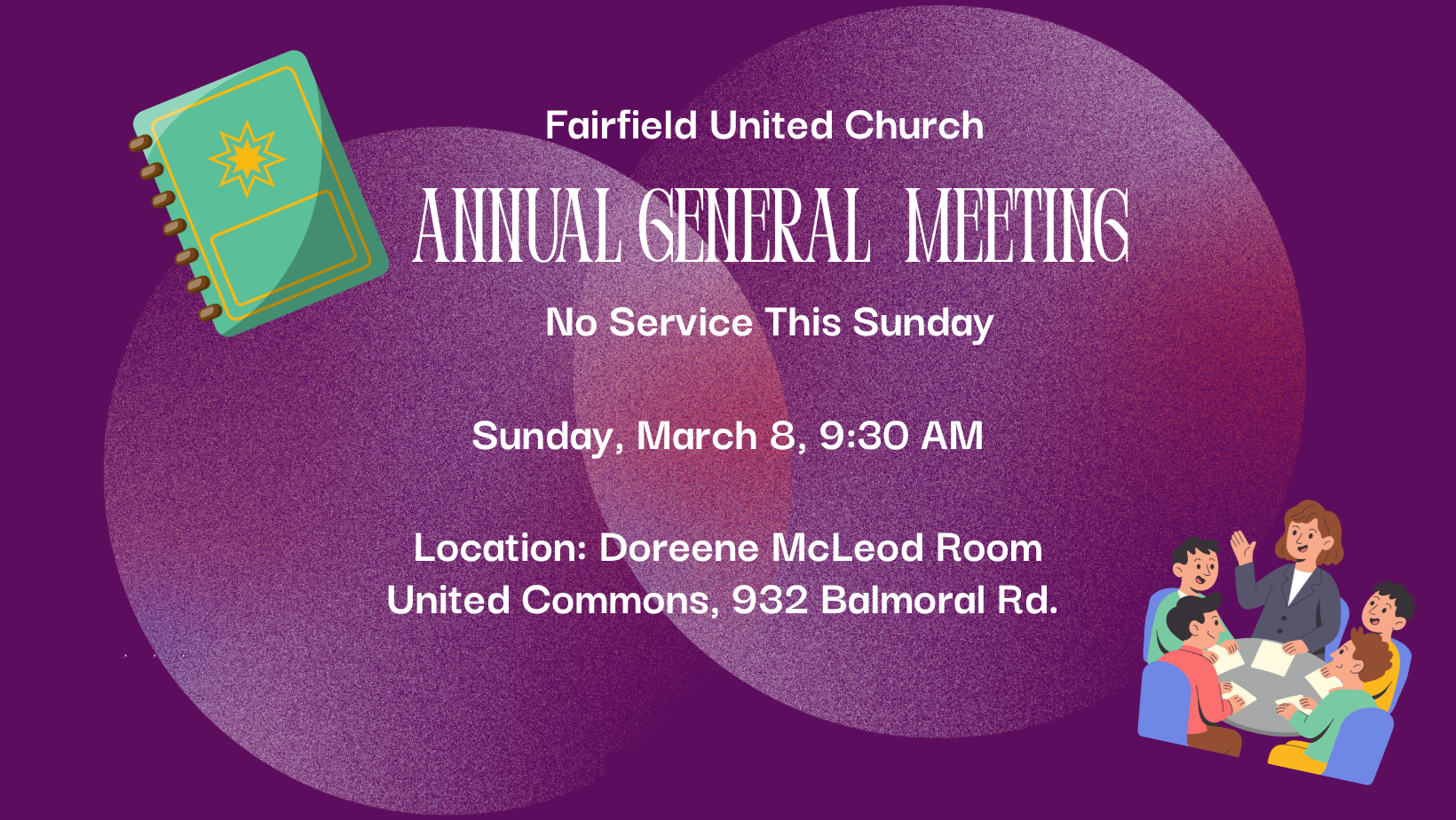 Weekly, we are meeting in the United Commons in the main sanctuary (932 Balmoral Rd) 9:30AM